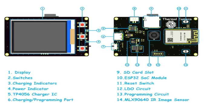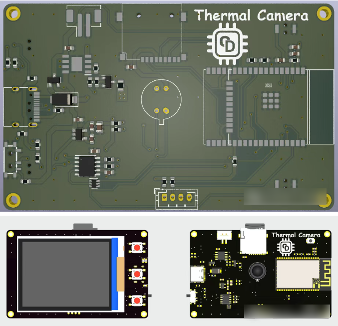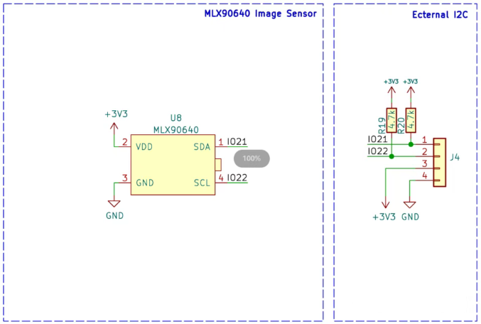 - Image Sensor: The MLX90640 image sensor is directly soldered to the PCB for a compact design. It's connected to the SoC via I2C with only 4 pins (including power and ground). An I2C connector on the PCB allows for using an image sensor module or adding other I2C devices.