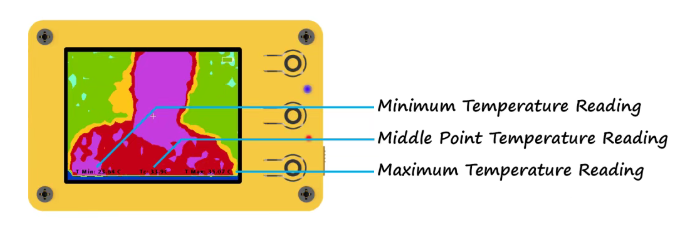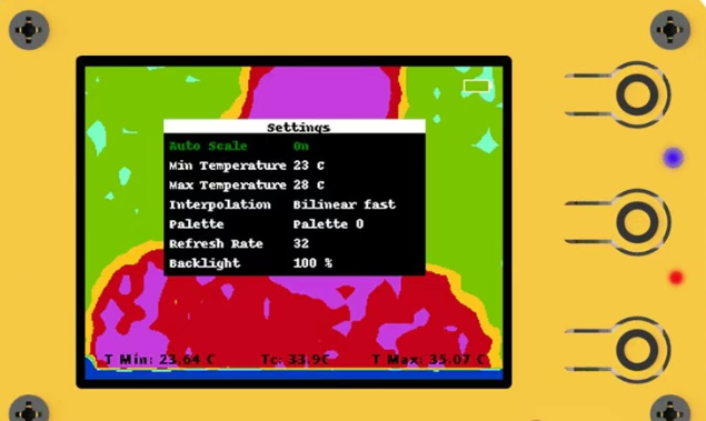 The main screen interface of the assembled DIY thermal imager shows the thermal image, along with the minimum, maximum, and mid - point temperatures, and a battery icon. The settings screen features 7 options. The selected option is displayed in green text, and others are in white. You can change the selection by short - pressing the middle button and adjust the value of the selected option using the up / + or down / - buttons.
