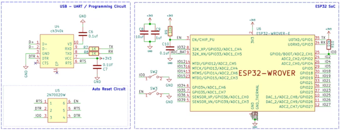 - Programming Circuit: The ESP32 SoC is paired with a programming circuit consisting of a CH340K USB - to - UART controller and ON Semi's 2N7002DW dual N - N - channel MOSFET. The CH340K is chosen for its small size and low cost. The MOSFET acts as an automatic reset circuit for the ESP32, though startup and reset buttons are also included as a backup.