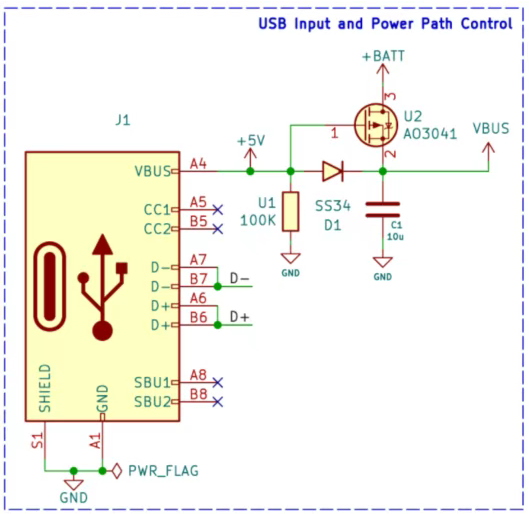 - Power and Charging: USB Type C is used for charging and programming. The power from the USB port is connected to a power path controller circuit with a P - channel MOSFET U2 and a diode D1. When USB power is available, the device runs on USB power while charging the internal battery. When USB power is cut off, it switches to battery power. A TP4056 charging controller with a maximum charging current of 1A is used to charge the internal battery. A classic voltage divider is used to detect the battery voltage.