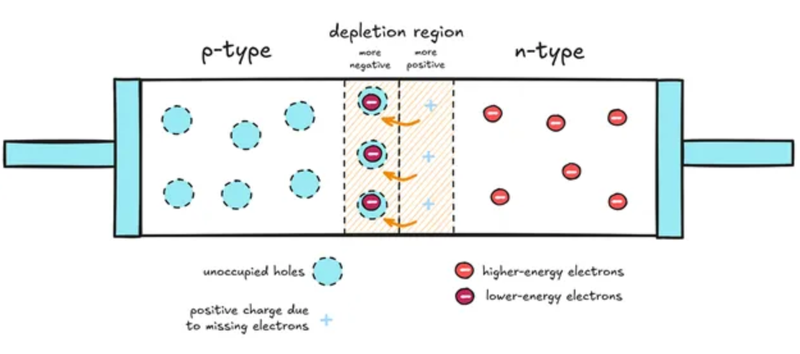 When n-type and p-type materials join, high-energy electrons from the n-side diffuse randomly into the p-side and rapidly recombine with abundant low-energy holes. This establishes an internal electric field across the junction, reaching thermodynamic equilibrium: the n-side becomes positively charged, and the p-side negatively charged.