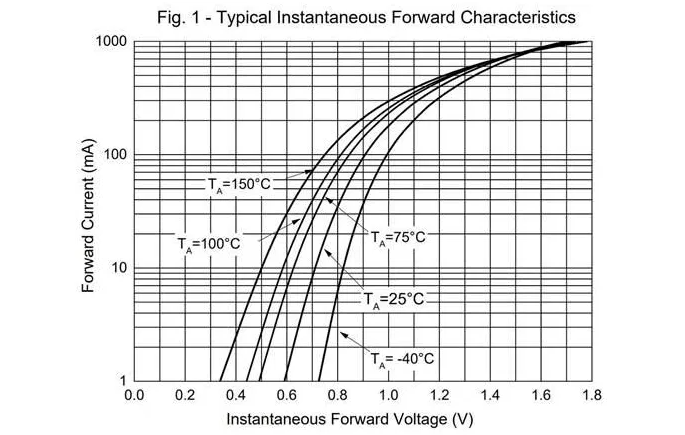 While precise mathematical modeling of real diodes is rarely useful, it’s worth noting that the V-I curve isn’t truly exponential. On a logarithmic scale—where exponential growth would appear as a straight line—the diode’s curve visibly bends, as shown in datasheets for common diodes like the 1N4148.