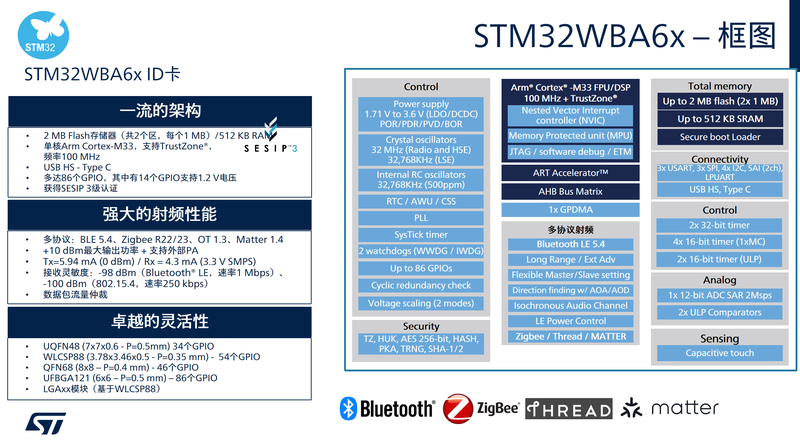 Compared with the STM32WBA5, the STM32WBA6 features a new dual - zone flash design, equipped with two 1MB flash memories, and the RAM has been increased to 512KB. This enables the STM32WBA6 to serve as the single - chip main MCU of a Matter end - node device, supporting over - the - air updates and concurrent modes.